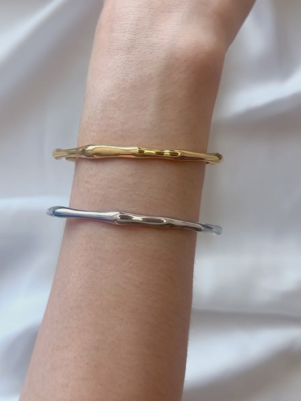 Sculptural bangles featuring soft, flowing curves. Made from PVD-coated surgical-grade stainless steel, this cuff is sweatproof, waterproof, and built to retain its shine through daily wear.